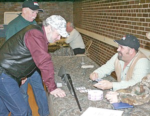 Mike Munro looks on as Todd Orr tries his luck at high-low poker for a chance to win a Weatherby .300 Win Mag. Dealer is Mike Cirian.