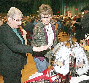 Ruth Corda, left, helps lucky winner Denise Schnackenberg choose from a table full of items Friday during the NRA banquet.