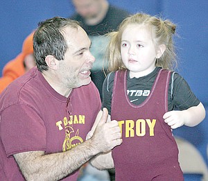 Peewee wrestler Cayla Hanson, 6, gets a few tips from coach Alan Carmignani Saturday during her match with Columbia Falls.