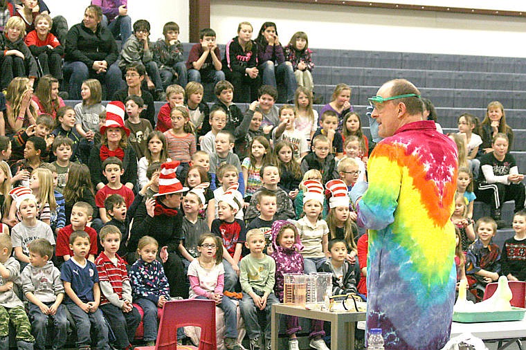 Mr. Benson shows students a science experiment on Friday for the I Love to Read Month celebration.