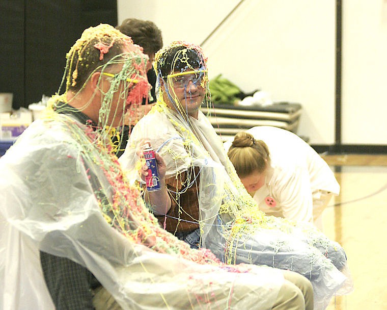 Plains School Superintendent Thom Chisholm silly-strings colleague Jim Holland, Plains Elementary principal, on Friday for the I Love To Read celebration. Top readers from each grade had the chance to silly-string the duo.