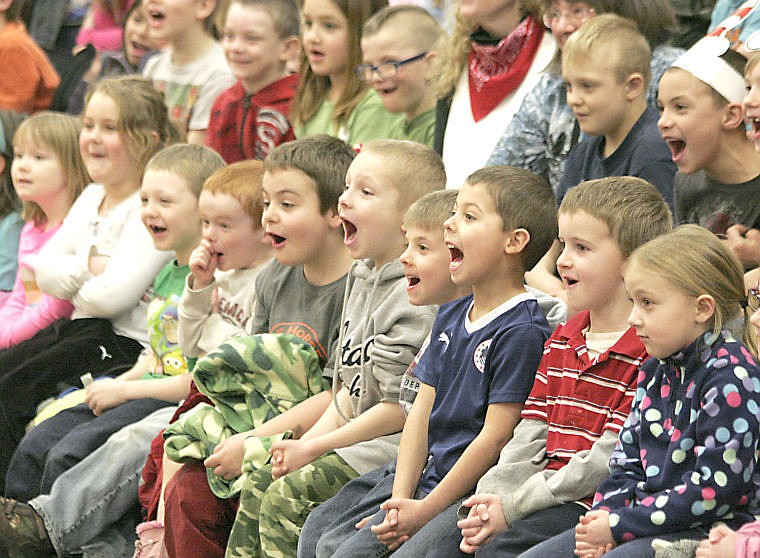 Kindergartners and first-graders are wowed by Mr. Benson's science experiment on Friday for I Love To Read Month.