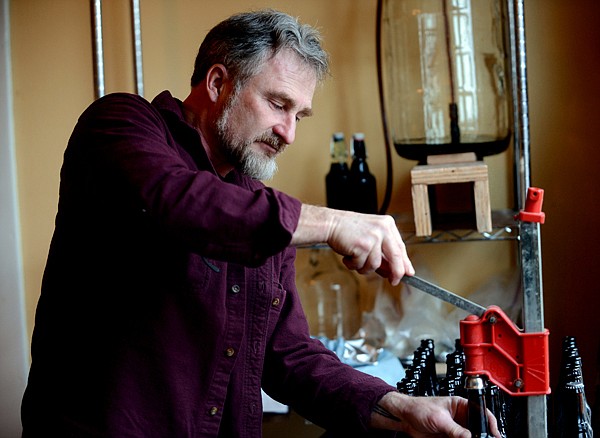 Rod Douglas bottles two cases of an oatmeal stout he prepared in late February on Thursday, March 7, at his home in Kalispell. (Brenda Ahearn/Daily Inter Lake)