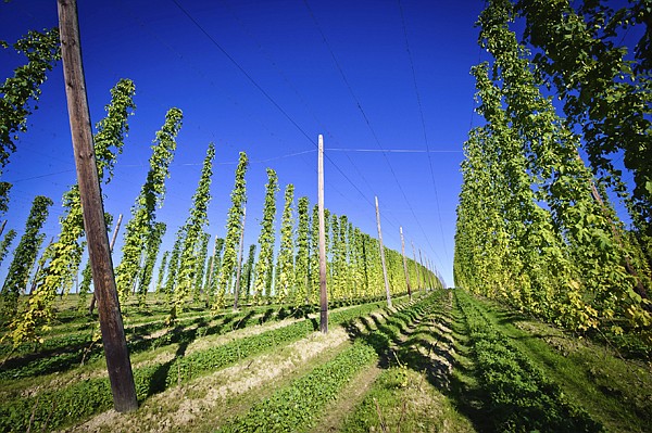 The commercial hops field trial at the Britz Ranch near Whitefish will use a trellis system with 18-foot poles similar to this one shown at a hops field in Austria. The local research aims to determine if commercial varieties of hops favored by craft beer brewers can be successfully grown in Western Montana. (©iStockphoto.com/tepic)