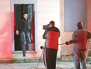 Actor Mighet Matanane exits Hotel Libby into a "hail of gun fire" Saturday as Robert Newman films this scene from "Doon Service."