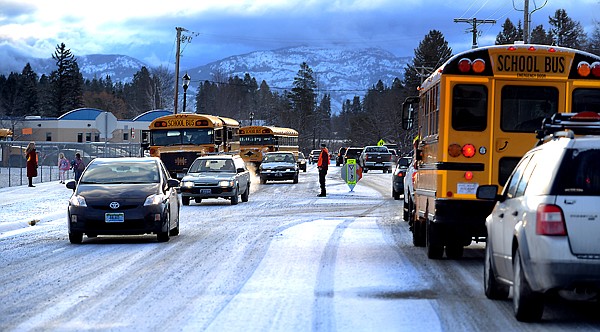 Cars and buses navigate the new traffic pattern at the intersection of East 7th Street and Ash Avenue in Whitefish on Monday morning, March 18. (Brenda Ahearn/Daily Inter Lake)