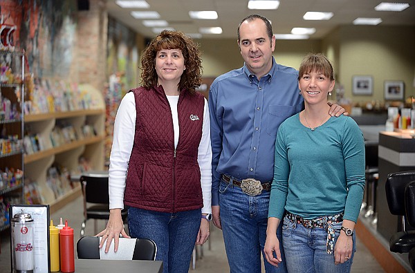From left, Susan Munsinger, Mark and Beth Pirrie, the family that runs Norms News on Thursday, March 21, in downtown Kalispell. (Brenda Ahearn/Daily Inter Lake)