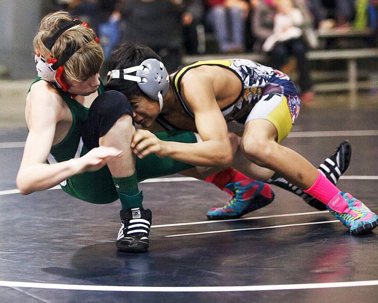Trae Vasquez, right, takes down Kaden Safranski during the 100-pound quarterfinal match Saturday afternoon during the Little Guy wrestling state tournament at the Flathead County Fairgrounds in Kalispell. Saturday, March 23, 2013 in Kalispell, Montana. (Patrick Cote/Daily Inter Lake)