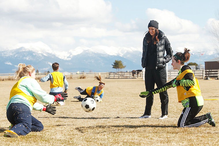 United States women's national soccer team goalkeeper Hope Solo, center, watches Sarah Schroeder, left, and Jordan Griffith run drills Sunday afternoon during a goalkeeper clinic put on by the Flathead Rapids Soccer Club.