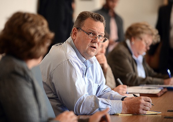 Sen. Jon Tester, D-Mont., speaks with Columbia Falls officials and members of the public on Tuesday at City Hall.