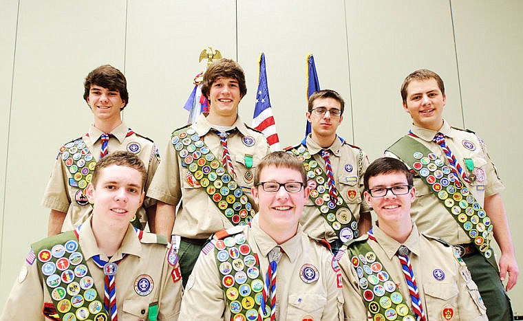 (back row, left to right) Bradley Jones, Nic Cramer, Kyle Direito, Sean Hartford, (front row, left to right) Hayden Jeschke, Mitch Byrnes and Brandon Meadors were presented Eagle awards Thursday evening at Edgerton Elementary School.. Thursday, March 28, 2013 in Kalispell, Montana. (Patrick Cote/Daily Inter Lake)