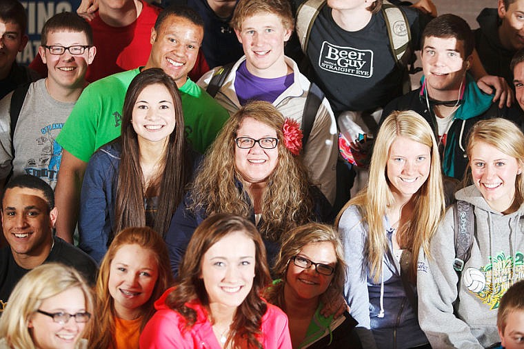 Natalie Davis, center, poses with several Glacier High School students. Friday, March 22, 2013 in Kalispell, Montana. (Patrick Cote/Daily Inter Lake)