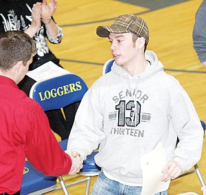 Wrestling coach Kelly Morford left and award recipient Mitch Haugen right. Winter activities awards assembly, March 6, 2013.