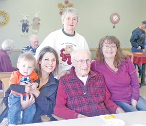 World War II veteran Ralph Hildreth celebrated his 99th birthday recently with family members. Relatives of five generations gathered for a ceremony. In the photo are Hildreth’s daughter, Sandra Blow, standing behind. From left is great- great-grandson Evan Woody, great-granddaughter Brandi Woody, Hildreth and his granddaughter Sheri Huffman. Hildreth has three daughters,14 grandchildren, 22 great-grandchildren and seven great- great-grandchildren.