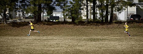 Across the field, Sam looks smooth and strong, a steady stride eating up ground. Max follows, wearing the same yellow shirt as his older brother that reads "iRun." Somewhere in the mix is Zachary in a white and red shirt with the words, "Run Strong."