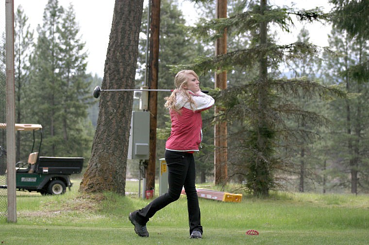 Sierra Bruning follows through her swing during the invitational tournament in Thompson Falls.