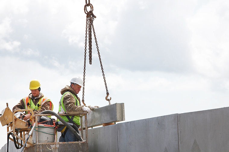 Jimmy Roth, left, and Roy Truman of Glacier Precast Concrete install an extension on the sound wall near the U.S. 93 Alternate Route west of Kalispell on Wednesday afternoon. Traffic may be affected when installation of the large extensions continues next week. May 1, 2013 in Kalispell, Montana. (Patrick Cote/Daily Inter Lake)