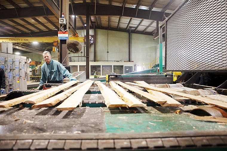 U.S. Sen. Max Baucus guides lumber into the board edger Wednesday morning at Plum Creek’s Evergreen sawmill. This was Baucus’ 94th “work day” in Montana.