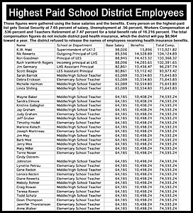 Some other notable salaries include Head Custodian Louis Mysse, at $47,745.36, highest paid Paraprofessional Billie Jo Jones at $27,420.22, and high school secretaries Mona Crismore, Karen Erickson and Linda Day with $32,262.11. Custodians, lunch workers, secretaries and district office employees have a benefit rate of 15.546 percent.