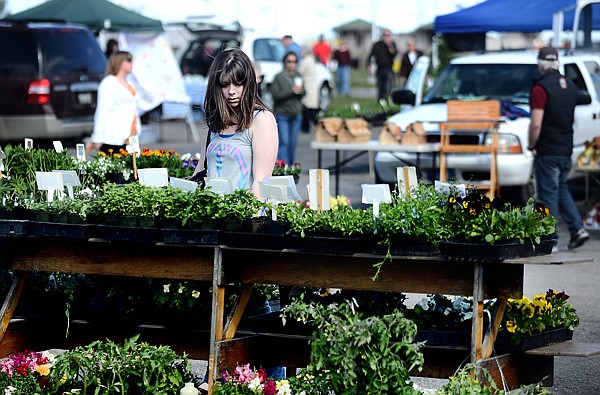 Kristina Uriz of Kalispell shops at the Kalispell Farmer's Market at it's new location at Flathead Valley Community College on Saturday morning, May 4. (Brenda Ahearn/Daily Inter Lake)