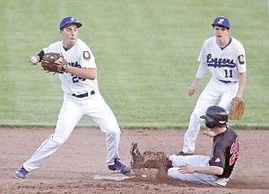 Jared Winslow gets a forceout at second before turning two to Andrew Haggerty at first base against Calgary.