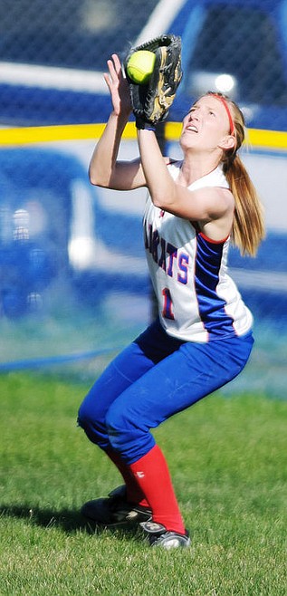 Wildkats sophomore outfielder Carlee Brown makes a catch in center field Tuesday evening during Columbia Falls' home loss to Polson. May 7, 2013 in Columbia Falls, Montana. (Patrick Cote/Daily Inter Lake)