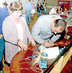 Kate Huntsberger watches as Josh Erickson signs a ticket for one of the many auction items.