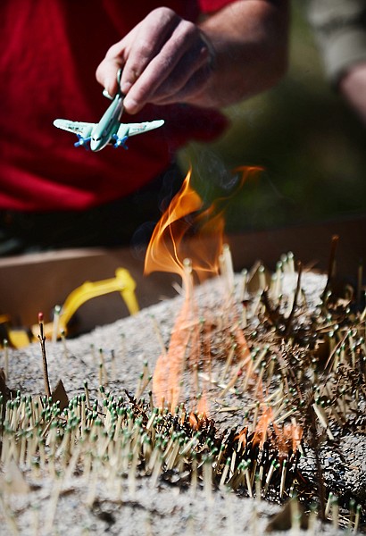 Jeremy Harker of the Glacier National Park Fire Management Team talks about forest ecology as he demonstrates how a fire can move across a landscape and the resources that may be called in to help deal with it, at the Forestry Expo on Wednesday, May 8, in Columbia Falls. (Brenda Ahearn/Daily Inter Lake)