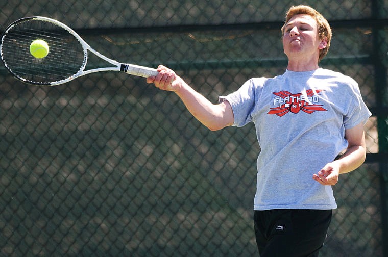 Flathead's Matt Widen returns a serve Thursday afternoon during the Class AA Northern divisional tennis tournament at Flathead Valley Community College.