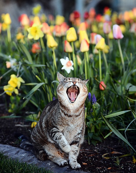 Scooter, one of the cats that at Bibler Gardens yawns widely as the sun begins to rise and light the blooming tulips at Bibler Gardens on Thursday, May 9, west of Kalispell. (Brenda Ahearn/Daily Inter Lake)