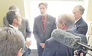 This April 24, 2013 photo shows a scrum of reporters and legislators forms around state Sens. Jason Priest, back left to right, Jon Sesso and Art Wittich as they discuss their dispute over a budget bill that delayed the end of the legislative session in Helena, Mont. Wittich and Priest lead one of the Republican factions that emerged during the 2013 session, hinting at a future battle for control of the political party. (AP Photo/Matt Volz).