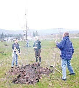 Park Committee and Tree Board Leader Vicky Lawrence, center, directs volunteers during a recent park tree-planting at Riverfront Park.