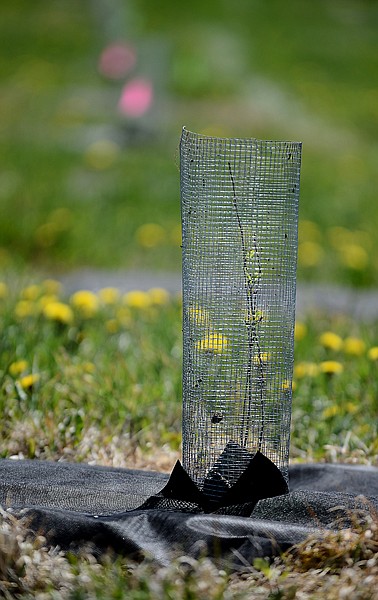 The cottonwood seedlings are protected by metal cages. (Brenda Ahearn/Daily Inter Lake)