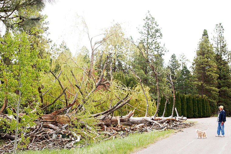 A Ponderosa Estates resident pauses while walking his dog Tuesday morning to check out a tree that was downed in the development north of Kalispell during Monday evening's storms. May 14, 2013 in Kalispell, Montana. (Patrick Cote/Daily Inter Lake)