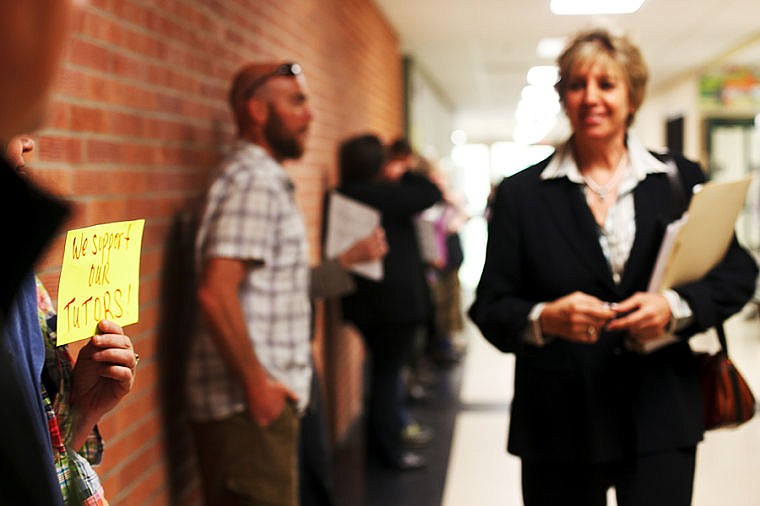 Protestors hold up signs Tuesday evening showing their support for tutors as school board members enter Kalispell Middle School for a board meeting. May 14, 2013 in Kalispell, Montana. (Patrick Cote/Daily Inter Lake)