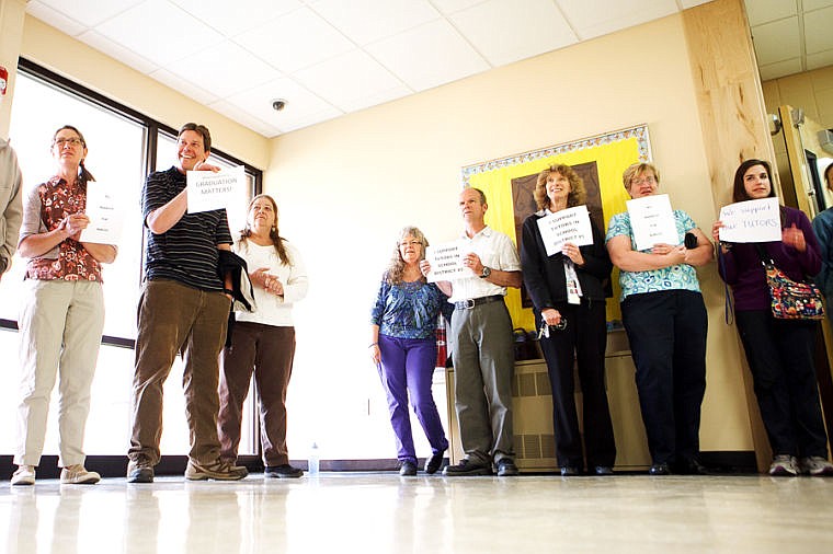 Some Kalispell Education Association members stood with tutors Tuesday as a show of solidarity, teachers union President Mike Thiel said. He said the service tutors provide to teachers and students is invaluable.