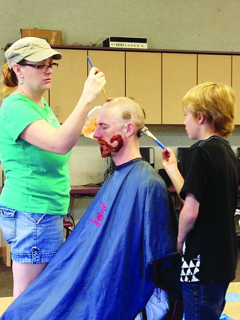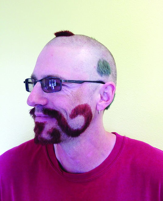Kalispell Montessori Elementary teacher David Cummings put on a smile Monday after having his head shaved into polka dots and his beard transformed into an extreme handlebar mustache.