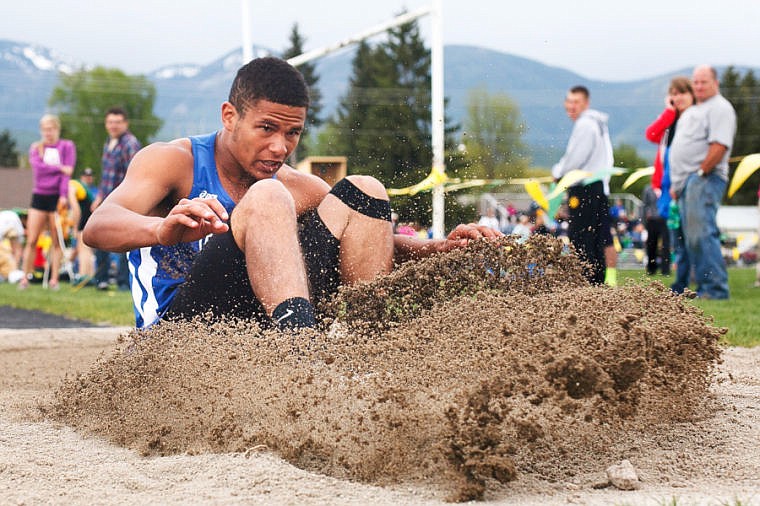 Columbia Falls’ Nakia Alexander lands in the pit at 43 feet, 6 1/2 inches to win the triple jump Friday afternoon during the Northwestern A divisional track meet at Whitefish High School.