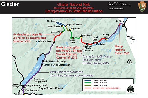 On the east side, snowplow crews are working beyond No Stump Point, below the East Side Tunnel and about 2.5 miles from Logan Pass.