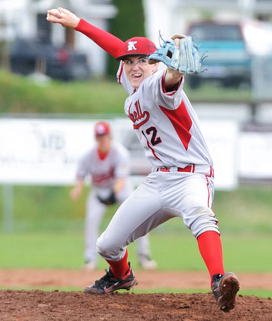 Kalispell pitcher Adam Frandsen winds up Saturday afternoon during the Lakers’ loss to the Calgary Reds at Griffin Field during the Canadian Days baseball tournament.