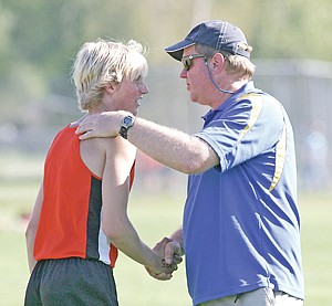 Perrin shaking hands with Libby track coach Jim May after his 4:09.24 1600, 5-10-13