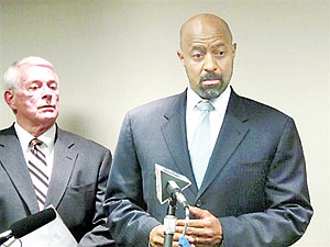 U.S. Attorney for Montana Michael Cotter, left, listens to Deputy Assistant Attorney General Roy Austin discuss an agreement on the University of Montana's handling of sexual assault cases on Thursday, May 9, 2013 in Missoula, Mont. Federal officials reached a deal with the university after a yearlong investigation Into mishandled sexual assault reports that will require the school to revise its policies and adequately respond. (AP Photo/Matt Gouras)