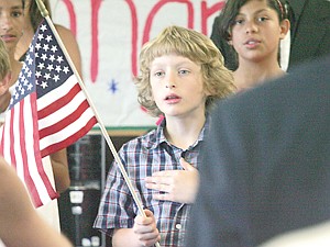 McCormick School student Carter during the national anthem, governor's shoulder at right.