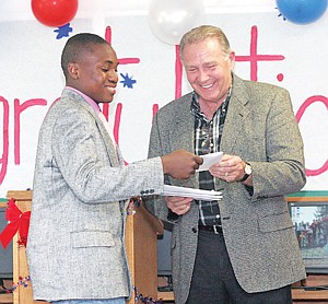 Denzel Tucker receives his diploma from school board member Terry Holmes Friday during graduation ceremonies at the McCormick School.
