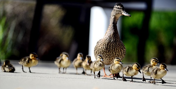 A mother mallard duck keeps a close watch on her 11 ducklings as they stroll through the enclosed patio at the Whitefish Care and Rehabilitation Center on Tuesday. This is at least the second year this duck has used the patio area as a safe haven to lay her eggs. The ducks are a source of excitement for the residents who do a head count of the ducklings several times a day and often visit each others’ rooms for better views.
