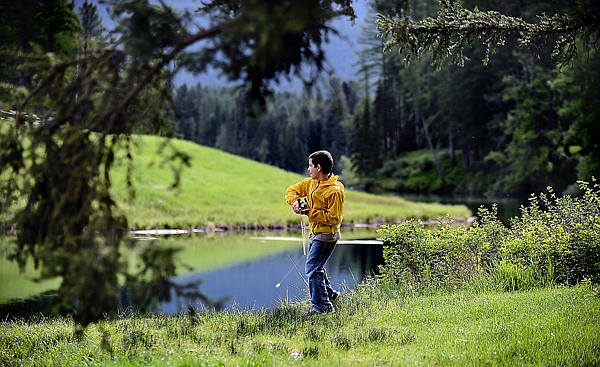 Kelvin Pandina, 9, a third grader at Stillwater Christian School works on his casting technique on Wednesday, May 22, at the Fish Fun Day at the Creston Fish Hatchery. (Brenda Ahearn/Daily Inter Lake)