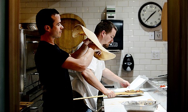 Engjell Vrapi and Robert Hawkins make pizzas on Wednesday, May 22, at the new Kalispell location of When in Rome located on First Avenue East. (Brenda Ahearn/Daily Inter Lake)