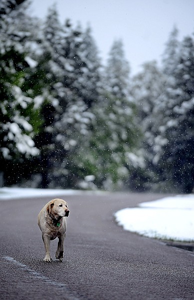 A dog makes its way down Dawn Drive in a light falling snow on Thursday morning, May 23, in Columbia Falls. (Brenda Ahearn/Daily Inter Lake)