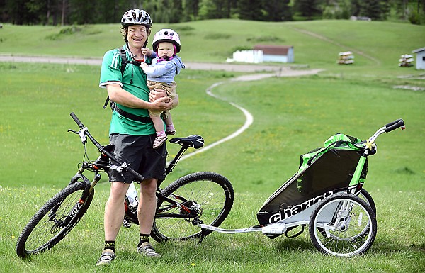 Cliff Kip and his 15 month old daughter Finley prepare to hit the trails on Saturday, May 25, at Herron Park west of Kalispell. (Brenda Ahearn/Daily Inter Lake)