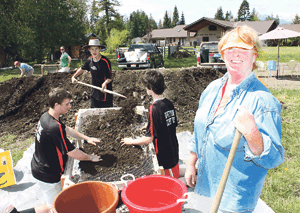 With the aid of volunteers who showed up a couple of weekends back, she started to whittle away at that mountain. Using feed sacks donated by Co-Op Gas & Supply, the volunteers filled several truckloads with 80-pound bags of rich soil. Before getting to that point, however, they spent hours sifting out the garbage that was left in the pile.